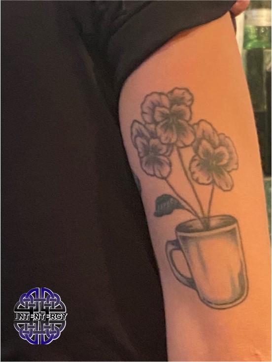 Kerry and Nancy have been married for nearly 51 years. Kerry is a retired veteran and educator. After being a stay-at-home mom who volunteered at the library/PTA, Nancy worked as a secretary at the same elementary school where Kerry taught. Their dedication to one another and their family has left lasting impressions on all they have met and was what helped Maddy get through one of the toughest times in her life. As she faced a life-threatening illness three years ago, Maddy was reminded time and again of the importance of family. With their support and her medical treatment, Maddy regained her health and grew closer than ever before with her family. That bond was the catalyst for inking her pansies in a tin cup memorial. She never wanted to feel apart from the unwavering devotion of her loved ones. It only made sense for an artist to create and embody that image using her own talents.